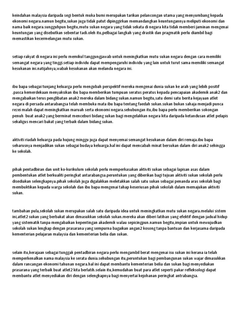 Sukan memainkan peranan penting kepada sesebuah negara. Subjek bahasa melayu diuji kepada pelajar dalam bentuk penulisan karangan.